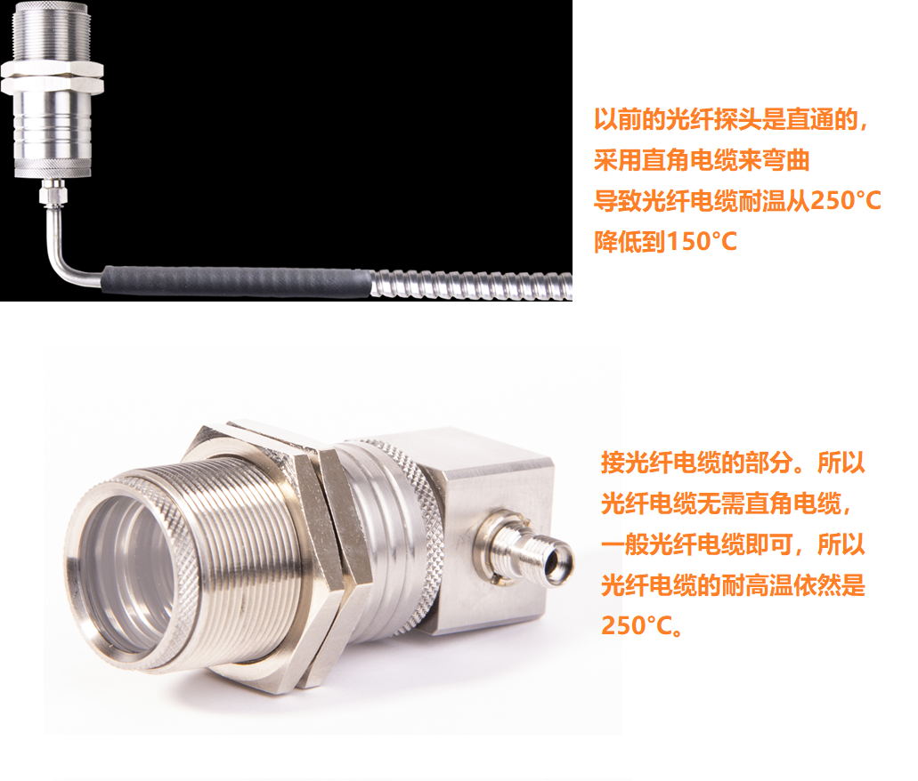 這樣我們就很容易理解直角光纖探頭的優(yōu)點(diǎn)了,就是不再使用彎角光纖電纜,保證了光纖電纜耐溫250°C不變。